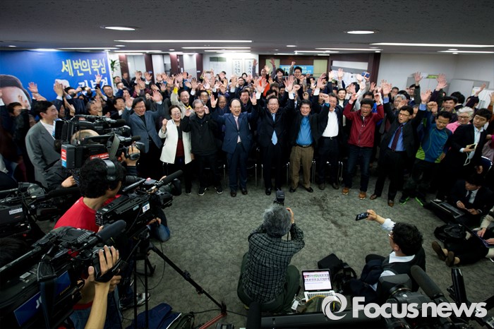 (대구=포커스뉴스) 제20대 국회의원선거 출구조사를 통해 김부겸 더불어민주당 대구 수성갑 후보가 김문수 새누리당 대구 수성갑 후보를 제치고 당선이 예측된 13일 오후 대구 수성구 김 후보 선거사무소에서 김부겸 후보가 지지자들과 만세를 외치고 있다.