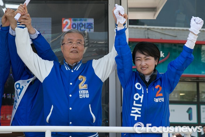 (서울=포커스뉴스) 13일 오후 9시40분 KBS는 개표율 36.4% 현재 경기 광명을 지역구 더불어민주당 이언주 후보가 52.4%를 득표해 당선이 확실하다고 밝혔다.(광명=포커스뉴스) 20대 총선을 이틀 앞둔 11일 오후 경기도 광명 하안사거리에서 이언주 광명을 후보(오른쪽)와 김종인(왼쪽) 더불어민주당 비대위 대표 겸 선대위원장이 지지를 호소하고 있다. 2016.04.11 박동욱 기자