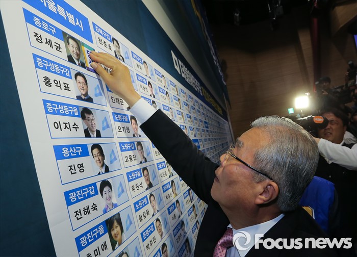 (서울=포커스뉴스) 20대 총선 투표일인 13일 오후 서울 여의도 국회 의원회관 대회의실에 마련된 더불어민주당 개표상황실에서 김종인 비대위 대표 겸 선대위원장이 당선이 확정된 정세균 종로구 후보의 사진 옆에 당선 스티커를 부착하고 있다.