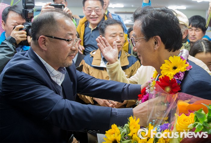 (부산=포커스뉴스) 전재수 더불어민주당 부산 북구강서구갑 후보가 13일 오후 부산 북구 선거사무소에서 당선이 확실시되자 지지자로부터 꽃목걸이를 받고 있다.