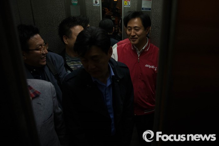 (서울=포커스뉴스) 제20대 국회의원선거일인 13일 오후 종로구에서 정세균 더불어민주당 후보에게 패배한 오세훈 후보가 지지자들과 인사를 하며 선거사무소를 빠져나가고 있다.