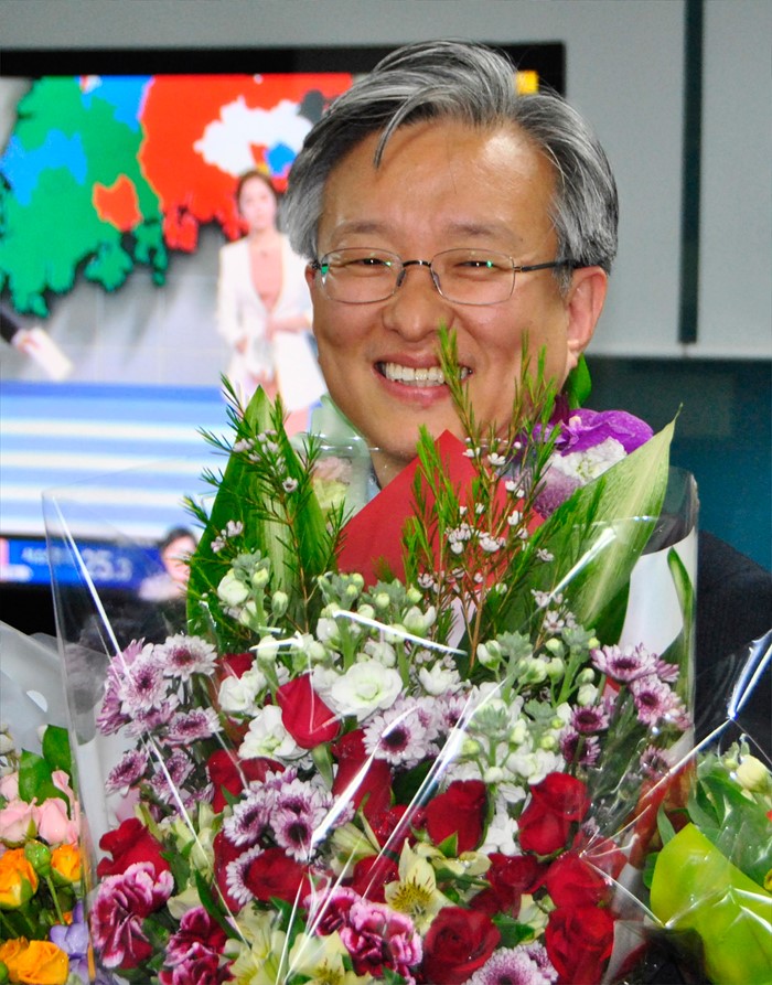 (서울=포커스뉴스) 20대 총선에서 당선이 유력한 권칠승 더불어민주당 경기 화성병 후보가 13일 경기도 화성 자신의 선거캠프에서 축하의 꽃다발을 들고 기뻐하고 있다. <사진제공=권칠승 후보 선거사무소>