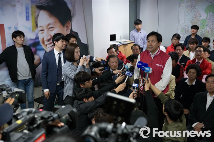 (서울=포커스뉴스) 제20대 국회의원선거일인 13일 오후 종로구에서 정세균 더불어민주당 후보가 당선이 확실시 된 가운데 오세훈 새누리당 후보가 서울 종로구 자신의 선거사무소에서 입장을 밝히고 있다.