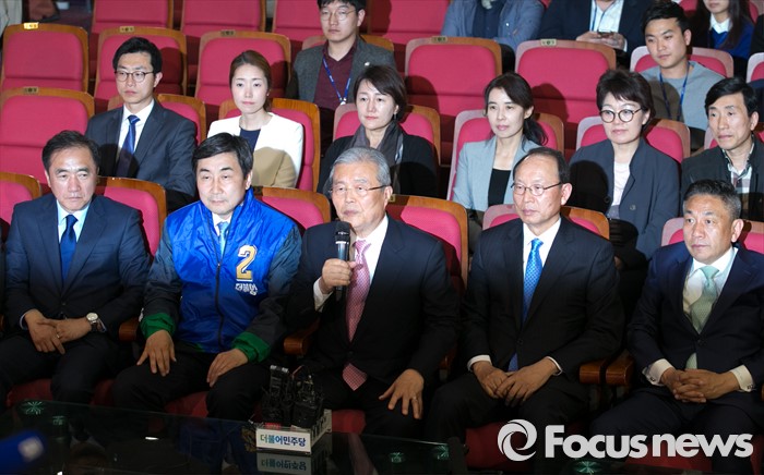 (서울=포커스뉴스) 20대 총선 투표일인 13일 오후 서울 여의도 국회 의원회관 대회의실에 마련된 더불어민주당 개표상황실에서 김종인(가운데) 비대위 대표 겸 선대위원장이 개표방송 시청 소감을 전하고 있다.