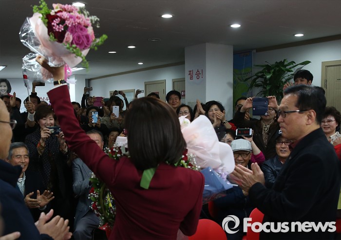 (서울=포커스뉴스) 제20대 국회의원 선거날인 13일 오후 서울 동작구에 위치한 선거사무실에서 나경원 새누리당 동작구을 후보가 지지자들에게 축하를 받고 있다.