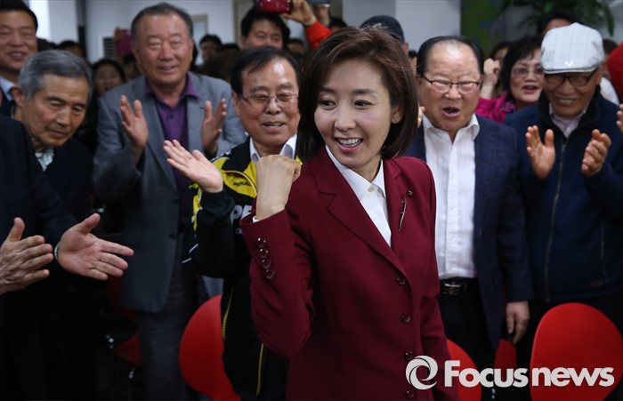 (서울=포커스뉴스) 제20대 국회의원 선거날인 13일 오후 서울 동작구에 위치한 선거사무실에서 나경원 새누리당 동작구을 후보가 지지자들에게 축하를 받고 있다.