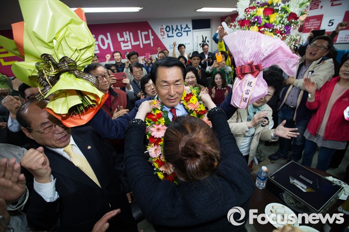 (인천=포커스뉴스) 제20대 국회의원선거 인천 중구동구강화군옹진군 선거구에서 당선이 확실시 된 안상수 무소속 후보가 13일 오후 인천 중구 선거사무소에서 지지자에게 꽃목걸이를 받고 있다.