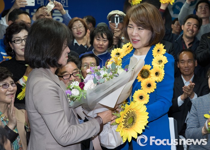 (서울=포커스뉴스) 전현희 더불어민주당 강남을 후보의 당선이 유력시된 14일 새벽 서울 강남구 로즈데일빌딩에 위치한 선거사무소에서 전 후보와 지지자들이 기뻐하고 있다.