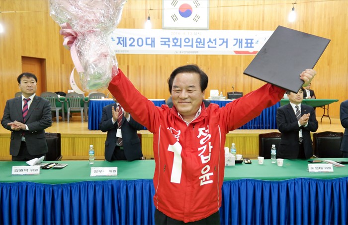 (서울=포커스뉴스) 20대 총선에서 당선이 확정된 정갑윤 새누리당 울산 중구 후보가 13일 울산의 한 개표소에서 당선증을 전달받고 기뻐하고 있다. <사진제공=정갑윤 후보 선거사무소>