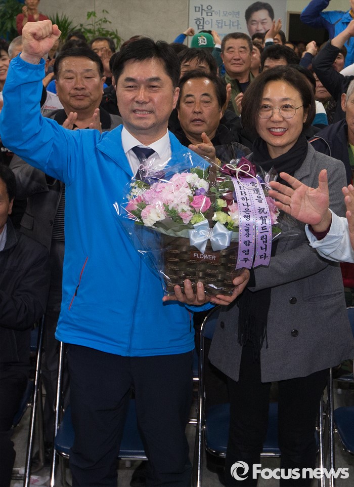 (논산=포커스뉴스) 제20대 충남 논산계룡금산 국회의원에 당선된 김종민 더불어민주당 당선인이 14일 논산 선거사무실에서 꽃바구니를 받고 환호하고 있다.