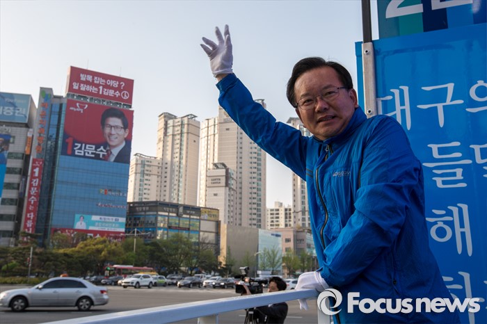 (대구=포커스뉴스) 제20대 국회의원선거 대구 수성구갑 선거구에서 당선된 더불어민주당 김부겸 당선자가 14일 오전 대구 수성구 범어네거리에서 당선 인사를 하고 있다.