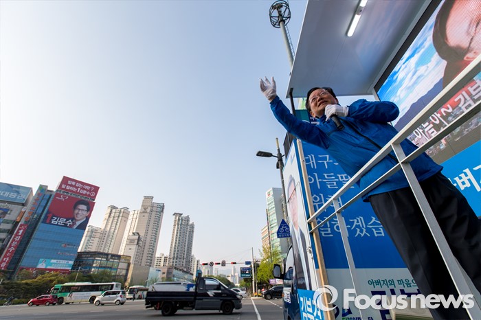 (대구=포커스뉴스) 제20대 국회의원선거 대구 수성구갑 선거구에서 당선된 더불어민주당 김부겸 당선자가 14일 오전 대구 수성구 범어네거리에서 당선 인사를 하고 있다.