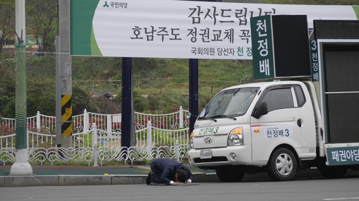 (광주=포커스뉴스) 14일 오전 광주 서구 풍암동 장미공원 사거리에서 제20대 국회의원 선거 광주 서구을에 당선된 천정배 국민의당 공동대표가 유권자들에게 감사를 표하며 큰절을 하고 있다. <사진제공=천정배 선거사무소>