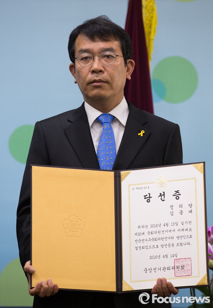(과천=포커스뉴스) 14일 오후 경기도 과천 중앙선거관리위원회 회의실에서 열린 제20대 국회의원선거 비례대표국회의원 당선증 교부식에 참석한 김종대 정의당 당선인이 기념촬영 하고 있다.