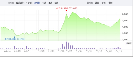한 연구원은 “1분기 전 세계 상선 발주량은 극히 부진한 수준”이라면서 “해양 수주공백으로 인한 국내 조선사들의 수주 감소는 불가피하다”고 말했다.대우조선해양 주가흐름<사진출처=네이버 캡쳐>