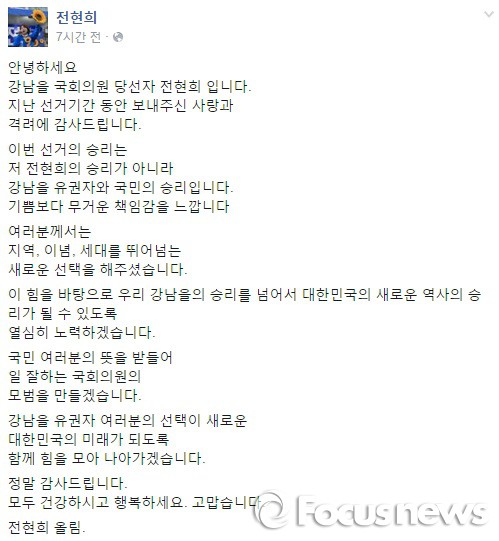 (서울=포커스뉴스) 24년만에 서울 강남 지역구(강남을) 야권 국회의원으로 당선된 전현희 더불어민주당 당선인이 자신의 SNS에 당선소감을 남겼다.