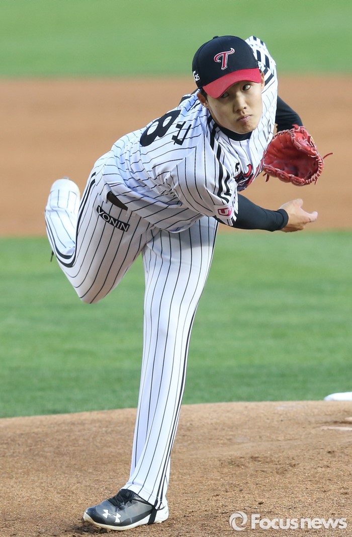 (서울=포커스뉴스) 14일 서울 잠실구장에서 열린 2016 프로야구 롯데-LG 경기에서 1회초 LG 선발투수 임찬규가 투구하고 있다.