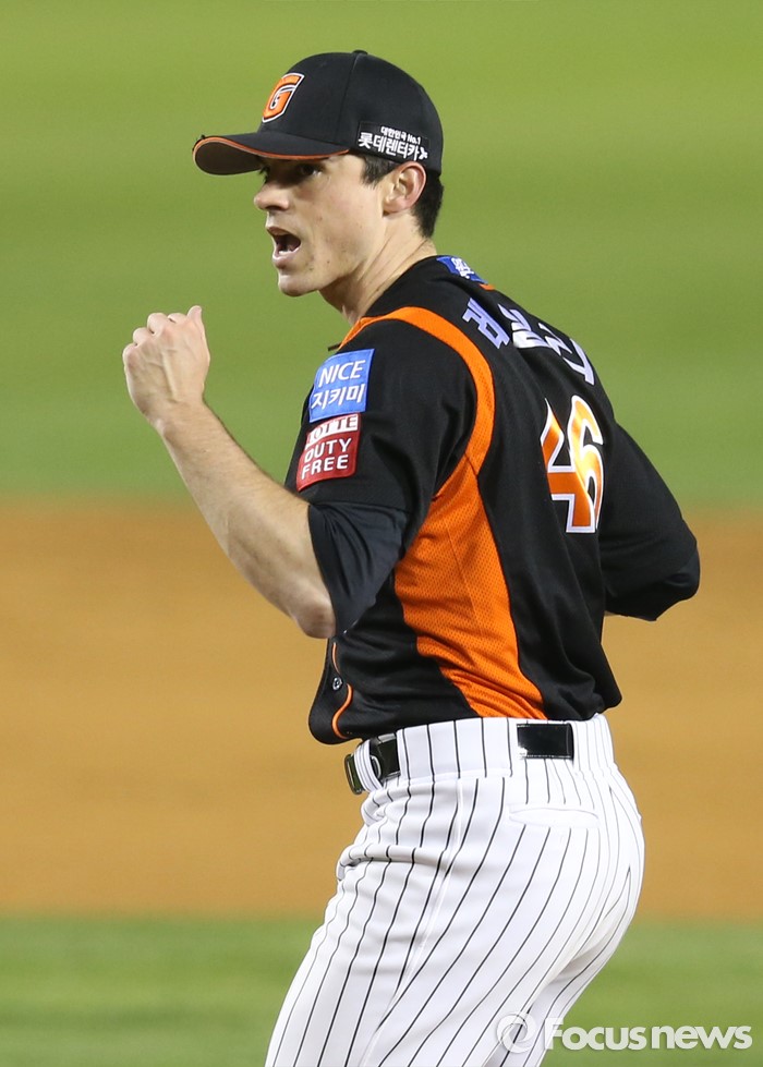 (서울=포커스뉴스) 14일 서울 잠실구장에서 열린 2016 프로야구 롯데-LG 경기에서 롯데 투수 레일리가 10탈삼진 무사사구 완봉승 거두고 주먹을 쥐며 환호하고 있다..