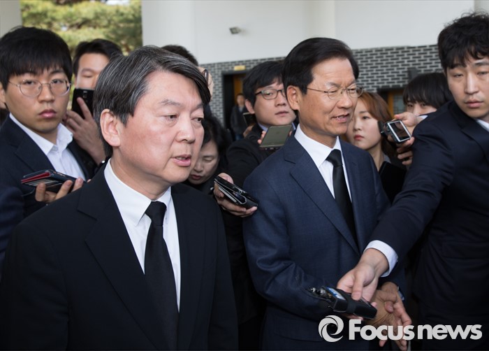 (서울=포커스뉴스) 안철수, 천정배 국민의당 상임공동대표와 20대 총선 당선인들이 15일 오전 서울 동작구 국립서울현충원에서 현충탑 참배를 마친 뒤 취채진 질문에 답변하고 있다.
