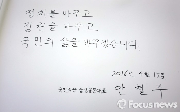 (서울=포커스뉴스) 안철수, 천정배 국민의당 상임공동대표와 20대 총선 당선인들이 15일 오전 동작구 국립서울현충원에서 현충탑 참배를 했다. 사진은 안 대표가 남긴 방명록.