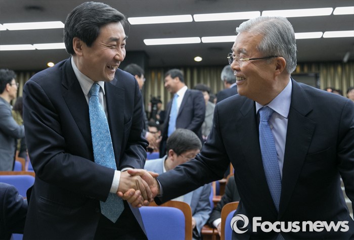 (서울=포커스뉴스) 김종인(오른쪽) 더불어민주당 비대위 대표 겸 선대위원장이 15일 오후 서울 여의도 국회에서 열린 20대 총선 중앙선대위 해단식에 참석해 이종걸 원내대표와 악수하고 있다.