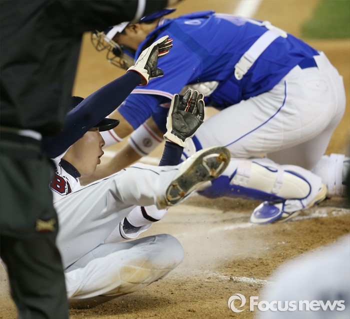 (서울=포커스뉴스) 15일 서울 잠실구장에서 열린 2016 프로야구 삼성-두산 경기 4회말 1사 1,2루에서 두산 김재호의 좌익수앞 안타때 2루주자 박건우가 홈까지 뛰어들어 세이프되고 있다.