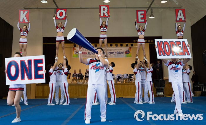 (서울=포커스뉴스) 17일 오후 서울 서대문구 동명여자중학교 체육관에서 열린 '2016 치어리딩 국가대표 선수단 출정식'에 참석한 선수들이 치어리딩 연기를 선보이고 있다.