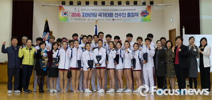 (서울=포커스뉴스) 17일 오후 서울 서대문구 동명여자중학교 체육관에서 열린 '2016 치어리딩 국가대표 선수단 출정식'에 참석한 선수들과 임원들이 파이팅을 외치고 있다.