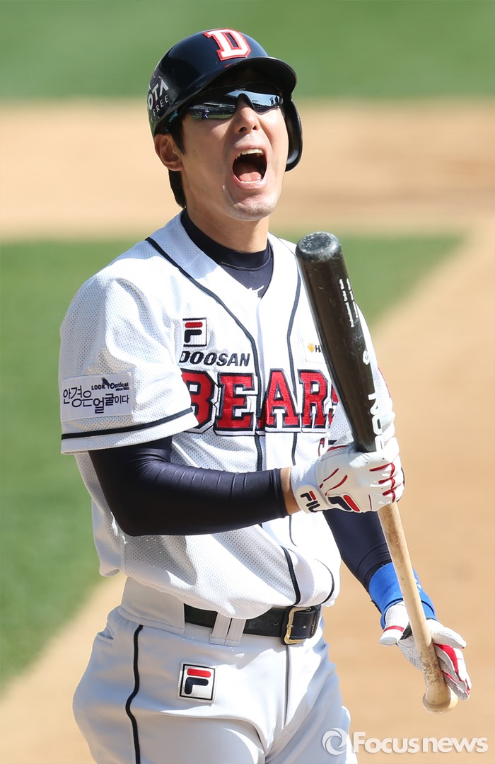 (서울=포커스뉴스) 17일 서울 잠실구장에서 열린 2016 프로야구 삼성-두산 경기 4회말 1사 2,3루에서 두산 김재호가 파울을 치고 아쉬워하고 있다.