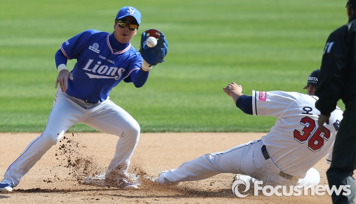 (서울=포커스뉴스) 17일 서울 잠실구장에서 열린 2016 프로야구 삼성-두산 경기 6회말 2사 1루에서 두산 1루주자 오재일이 2루 도루를 시도해 세이프되고 있다.