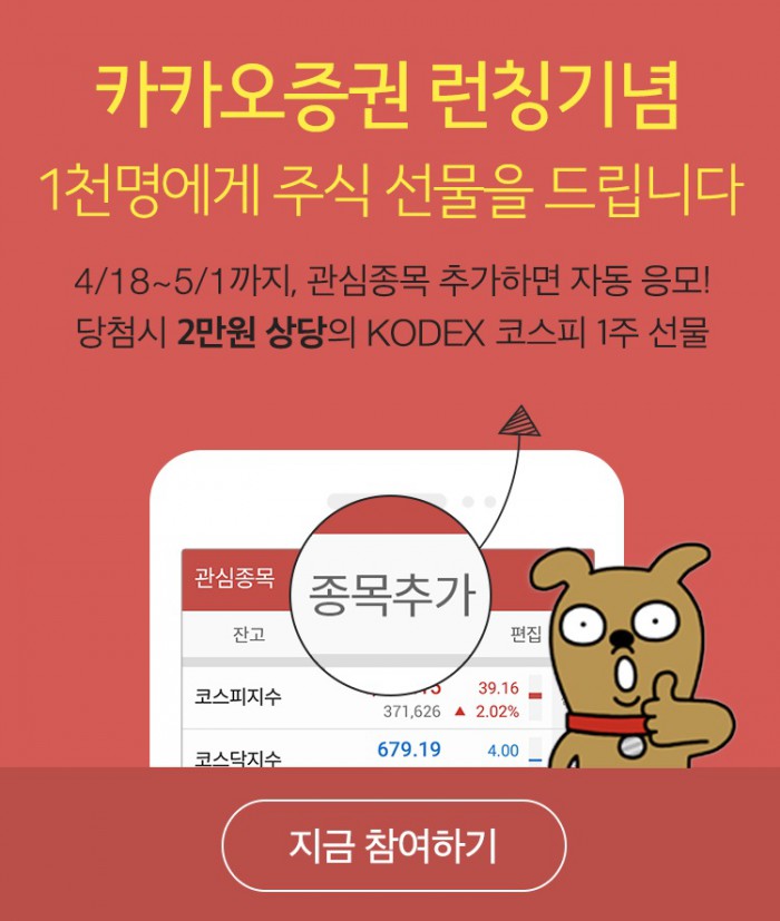 카카오증권 리브랜딩 기념, 관심종목 1개 이상 추가한 사용자 중 추첨