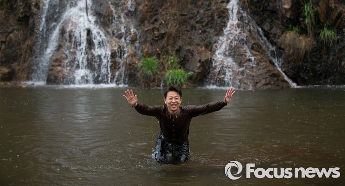 (서울=포커스뉴스) 제20대 국회의원 선거에서 당선된 김영호 더불어민주당 서대문을 당선자가 18일 오후 서울 서대문구 홍제천 폭포마당에 입수 하고 있다. 김 당선자는 서대문을 지역 투표율 60% 달성 시 홍제천 입수, 아내는 픽미댄스를 추겠다고 약속 하였다.
