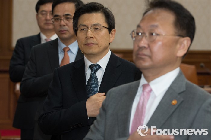 (서울=포커스뉴스) 황교안 국무총리가 19일 오전 서울 종로구 정부서울청사에서 열린 국무회의에 참석해 국기에 대한 경례를 하고 있다.
