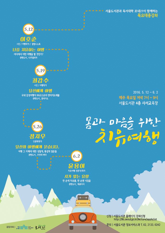 이후 다음달 19일에는 최갑수 작가가 '국내 감성여행지 99곳으로의 빈티지트레블', 다음달 26일에는 정지우 작가가 '여행 그 자체에 대한 성찰적, 통섭적 질문들'이라는 주제로 강의한다.