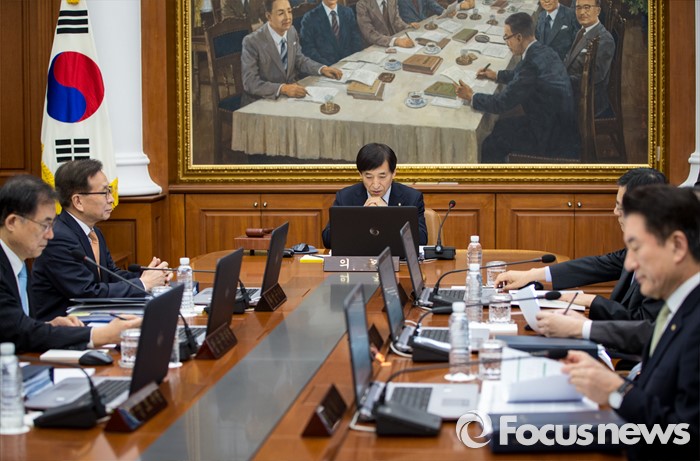 (서울=포커스뉴스) 이주열 한국은행 총재는 올해 경제성장률 전망치를 기존 3.0%에서 2.8%로 낮춘다고 19일 밝혔다.(서울=포커스뉴스) 19일 오전 서울 중구 남대문로 한국은행 본관에서 열린 금융통화위원회의에 참석한 이주열 한국은행 총재와 금통위원들이 취재진의 퇴장을 기다리고 있다. 2016.04.19 양지웅 기자
