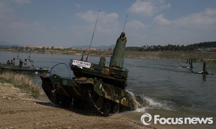 (여주=포커스뉴스) 19일 오전 경기도 여주시 남한강 일대에서 육군 20사단이 K-2 흑표전차 잠수도하훈련을 하고 있다. K-2흑표전차는 최고 4.1m수심의 하천을 문교나 부교없이 독자적으로 건널 수 있다.