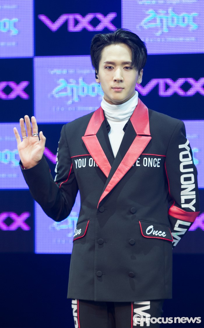 홀서울=포커스뉴스) 19일 오후 서울 마포구 롯데카드 아트센터에서 열린 아이돌그룹 VIXX의 싱글앨범 'Zelos' 발표 쇼케이스에 참여한 멤버 라비가 포토타임을 갖고 있다.