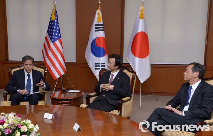 (서울=포커스뉴스) 윤병세 외교부 장관이 19일 오후 서울 종로구 외교부에서 열린 한미일 외교차관 접견에서 토니 믈링컨 미국 국무부 부장관과 대화를 나누고 있다.