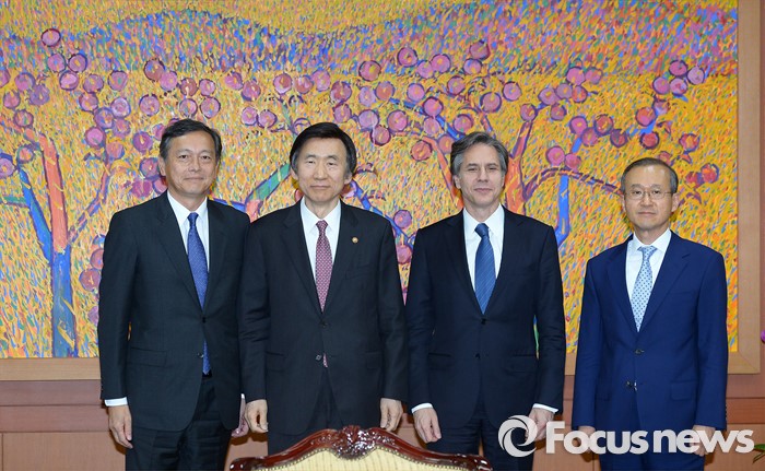 (서울=포커스뉴스) 윤병세 외교부 장관이 19일 오후 서울 종로구 외교부에서 한미일 외교차관과 접견에 앞서 사진촬영을 하고 있다. 왼쪽부터 사이키 아키타카 일본 외무성 사무차관, 윤병세 외교부 장관, 토니 블링컨 미국 국무부 부장관, 임성남 외교부 제1차관.