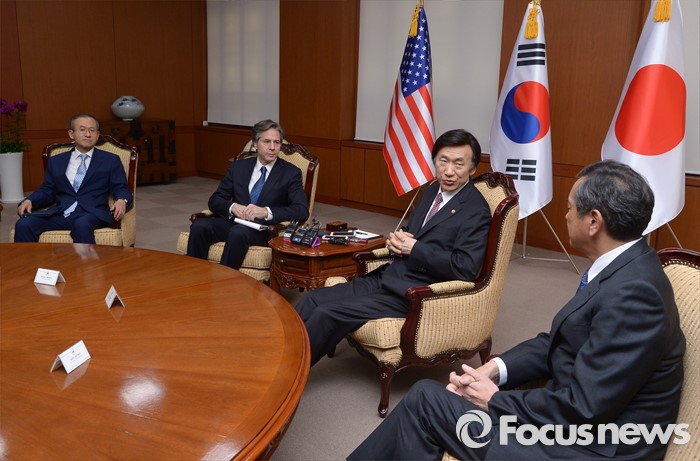 (서울=포커스뉴스) 윤병세 외교부 장관이 19일 오후 서울 종로구 외교부에서 열린 한미일 외교차관 접견에서 사이키 아키타카 일본 외무성 사무차관과 대화를 나누고 있다.