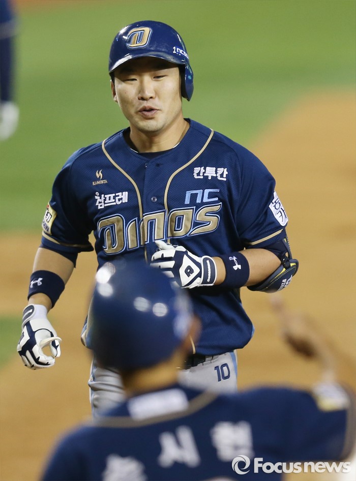 (서울=포커스뉴스) 19일 서울 잠실구장에서 열린 2016 프로야구 NC-LG 경기 6회초 2사 2루에서 NC 지석훈이 좌월 2점 홈런을 치고 선행주자 손시헌의 환영을 받으며 홈인하고 있다.