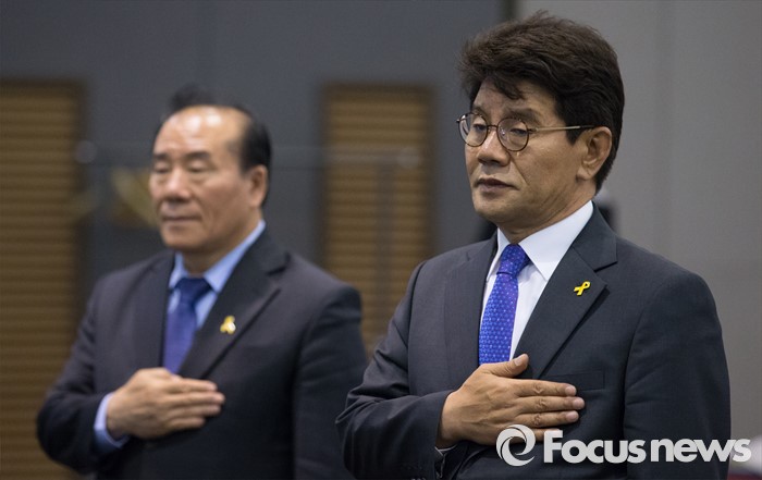 (인천=포커스뉴스) 이청연(오른쪽) 인천시교육감과 장휘국 광주시교육감이 20일 오후 인천 중구 하버파크호텔에서 열린 전국 시도교육감협의회 간담회에 참석해 국민의례 하고 있다.