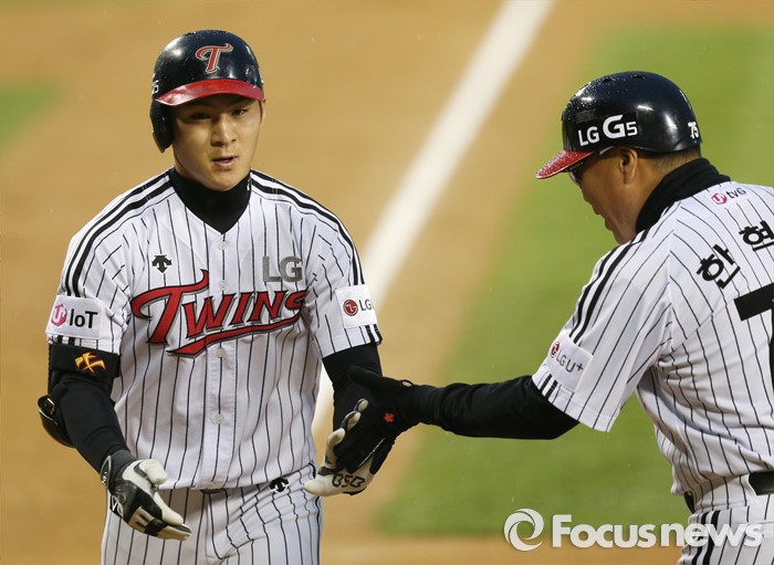 (서울=포커스뉴스) 20일 서울 잠실구장에서 열린 2016 프로야구 NC-LG 경기 2회말 2사 1,2루에서 LG 오지환이 우중월 3점 홈런을 치고 한혁수 코치의 환영을 받으며 홈인하고 있다.