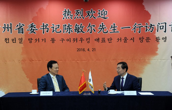 박 시장은 21일 서울시청에서 천 서기와 만나 "구이저우성은 3년 연속 중국 내 경제성장률 3위권에 진입할만큼 발전 잠재력이 큰 지역"이라며 "앞으로 서울시와 빅데이터산업과 관광산업 등 실질적인 경제협력을 강화해 나가길 기대한다"고 밝혔다.