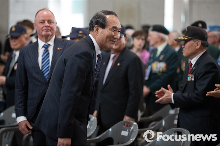 (서울=포커스뉴스) 21일 오후 서울 용산구 전쟁기념관에서 열린 6.25 전쟁영웅 선정패 수여식에서 박승춘 국가보훈처장이 참전용사들에게 인사하고 있다.