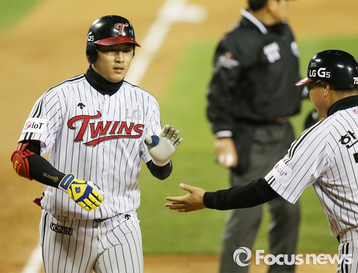 (서울=포커스뉴스) 21일 서울 잠실구장에서 열린 2016 프로야구 NC-LG 경기 4회말 1사후 LG 서상우가 좌중월 1점 홈런을 치고 한혁수 코치의 호나영을 받으며 홈인하고 있다.