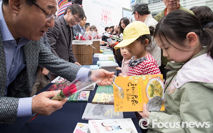 (서울=포커스뉴스)유네스코가 1995년 제정한 ‘세계 책과 저작권의 날’인 23일 오전 서울 중구 청계광장에서 열린 2016 세계 책의 날 기념 책드림 행사 '두근두근 책 속으로'에서 출판 관계자들이 어린이들에게 책과 꽃을 나눠주고 있다.