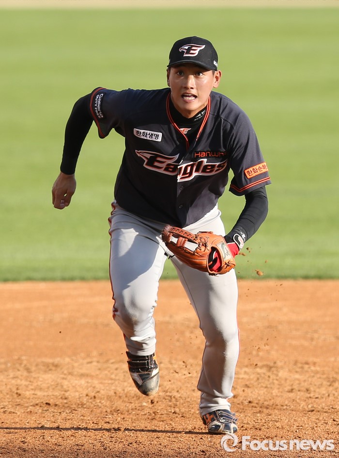 (서울=포커스뉴스) 24일 서울 잠실구장에서 열린 2016 프로야구 한화-두산 경기 2회말 한화 3루수 신성현이 두산 정수빈의 타구를 잡으려 달려들고 있다.
