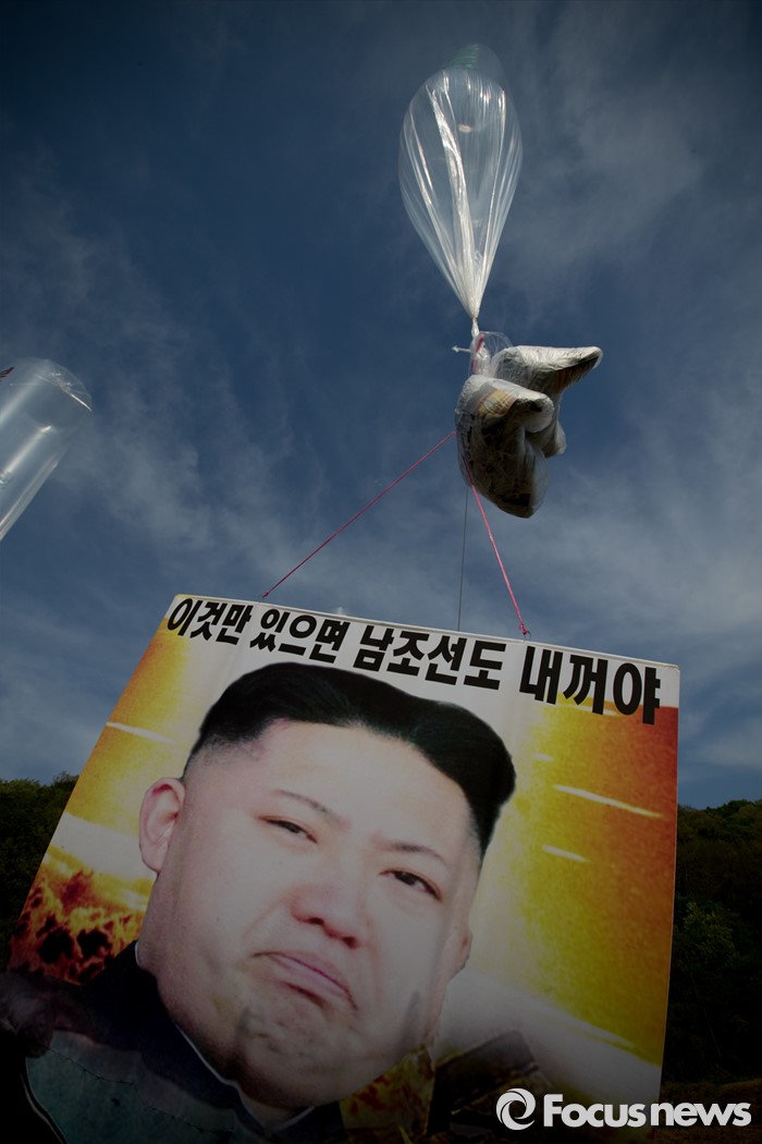 (파주=포커스뉴스) 29일 오후 경기 파주 낙하IC 인근에서 탈북자단체인 자유북한운동연합이 북한에 핵과 미사일을 포기하고 국제사회 일원으로 참여할 것을 촉구하는 내용의 대북전단을 날려보내고 있다.