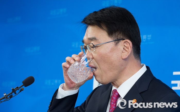 (세종=포커스뉴스) 강호인 국토교통부장관이 27일 오후 세종시 정부세종청사 국토부 기자실에서 맞춤형 주거지원을 통한 주거비 경감 방안 발표 중 목을 축이고 있다.